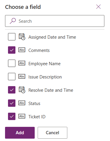 When adding the Power Apps visual, select the fields needed for updating tickets. For this scenario, we are selecting:
